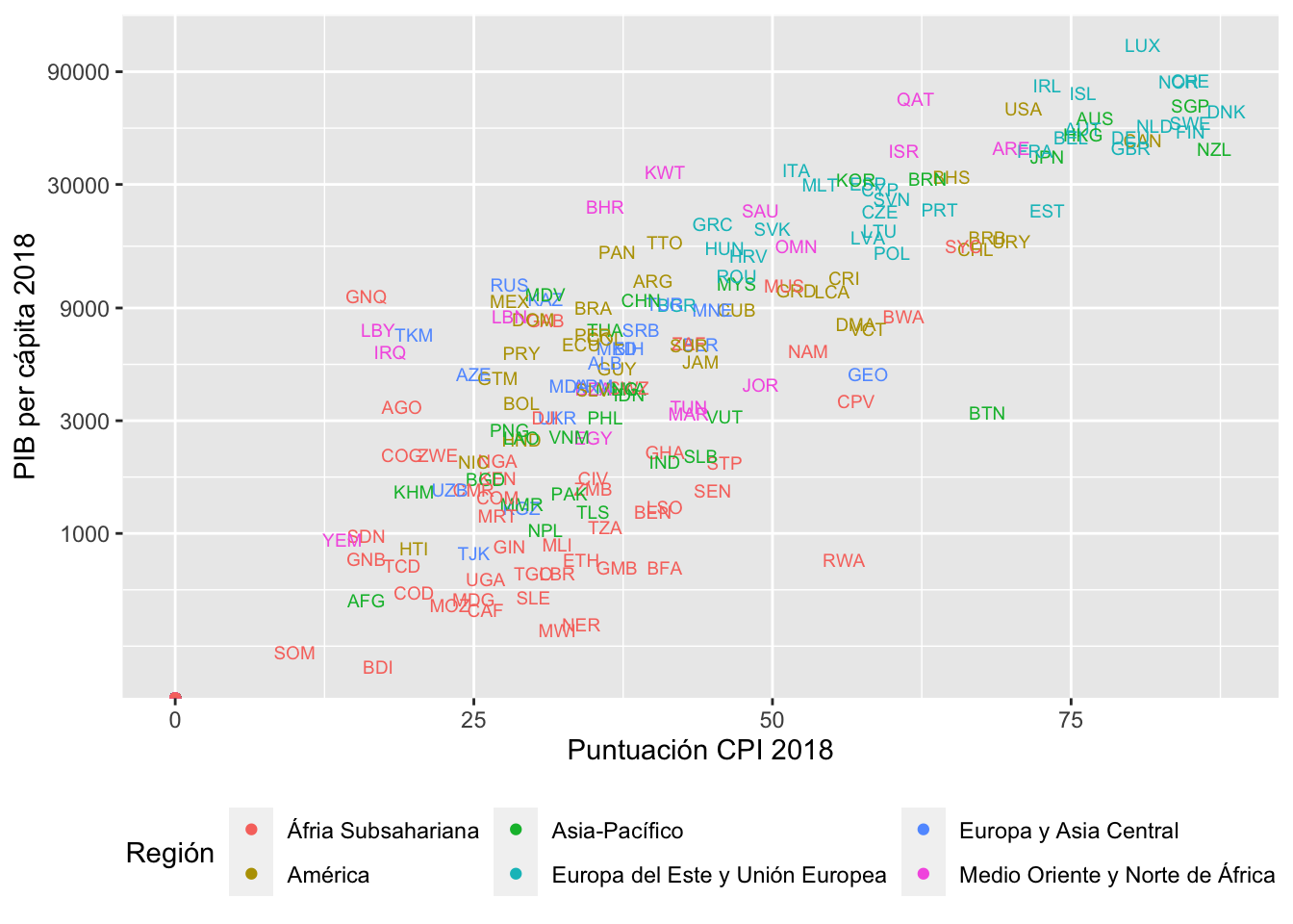 El Ecuador posee una puntuación de 38 en una escala de 0 (más corrupto) a 100 (menos corrupto) en el IPC, por debajo del promedio mundial, el cual se encuentra en 43.17. ¿Y por qué nos preocupa tanto? Pues, existe una fuerte correlación entre corrupción y desarrollo económico. No es coincidencia que los países más ricos sean menos corruptos y los más pobres sean más corruptos. Si graficamos el IPC de cada país con respecto a su PIB per cápita, la relación es bastante clara. A medida que el IPC es más alto, también lo es el PIB per cápita.
