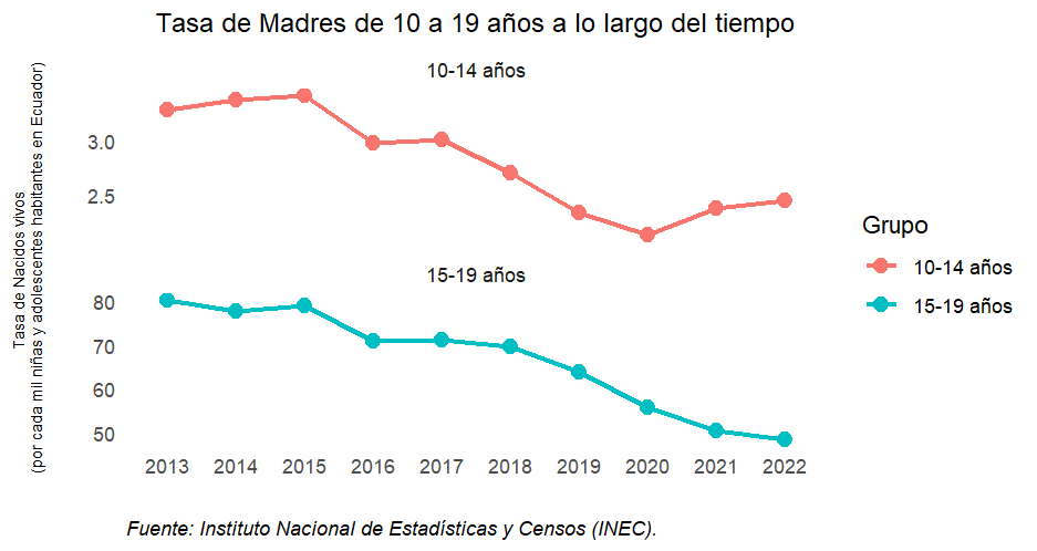 A lo largo de la última década, tanto la tasa de nacidos vivos en niñas de 10 a 14 años como la tasa de embarazos en adolescentes de 15 a 19 años en Ecuador han disminuido. Sin embargo, es crucial tomar en cuenta la leve variación al alza a partir de 2020 en la tasa de nacidos vivos en niñas de 10 a 14 años lo sugiere una posible reversión en la tendencia descendente.