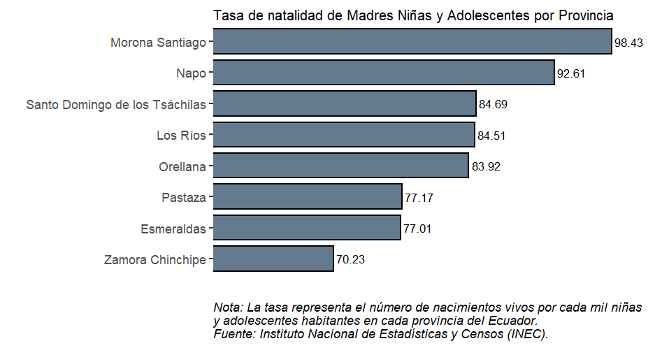 Ecuador históricamente ha enfrentado una problemática social y de salud pública1 difícil de ignorar: el embarazo infantil y adolescente. De acuerdo con las cifras del Instituto Nacional de Estadísticas y Censos (en adelante INEC), aproximadamente 5 niñas de 10 a 14 años y 104 adolescentes de 15 a 19 años son madres diariamente2. En el 2013, según datos del Informe del Estado Mundial de Población, la tasa de embarazo en adolescentes en Ecuador se encontraba entre las más altas de América Latina, después de Nicaragua y República Dominicana[1].