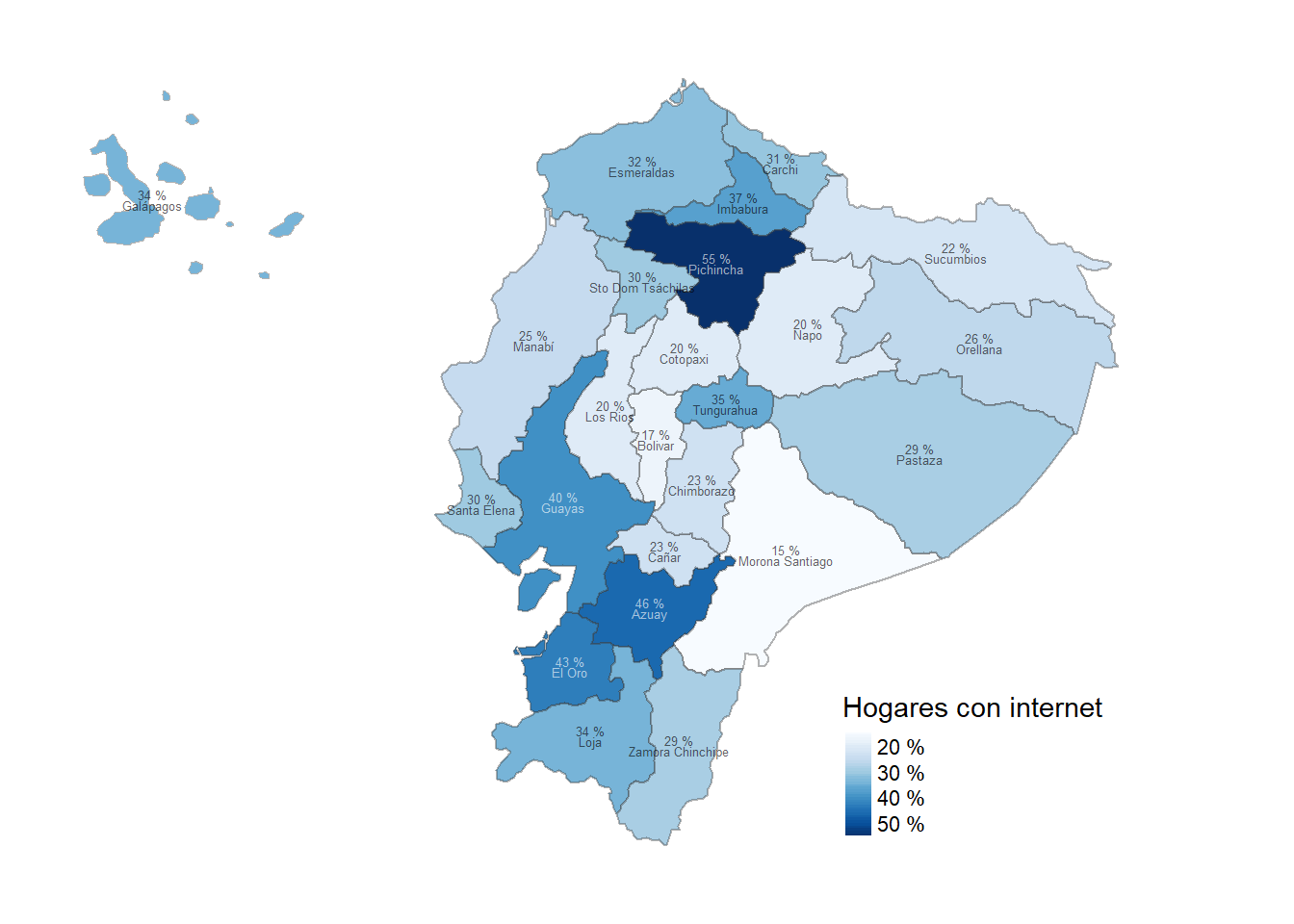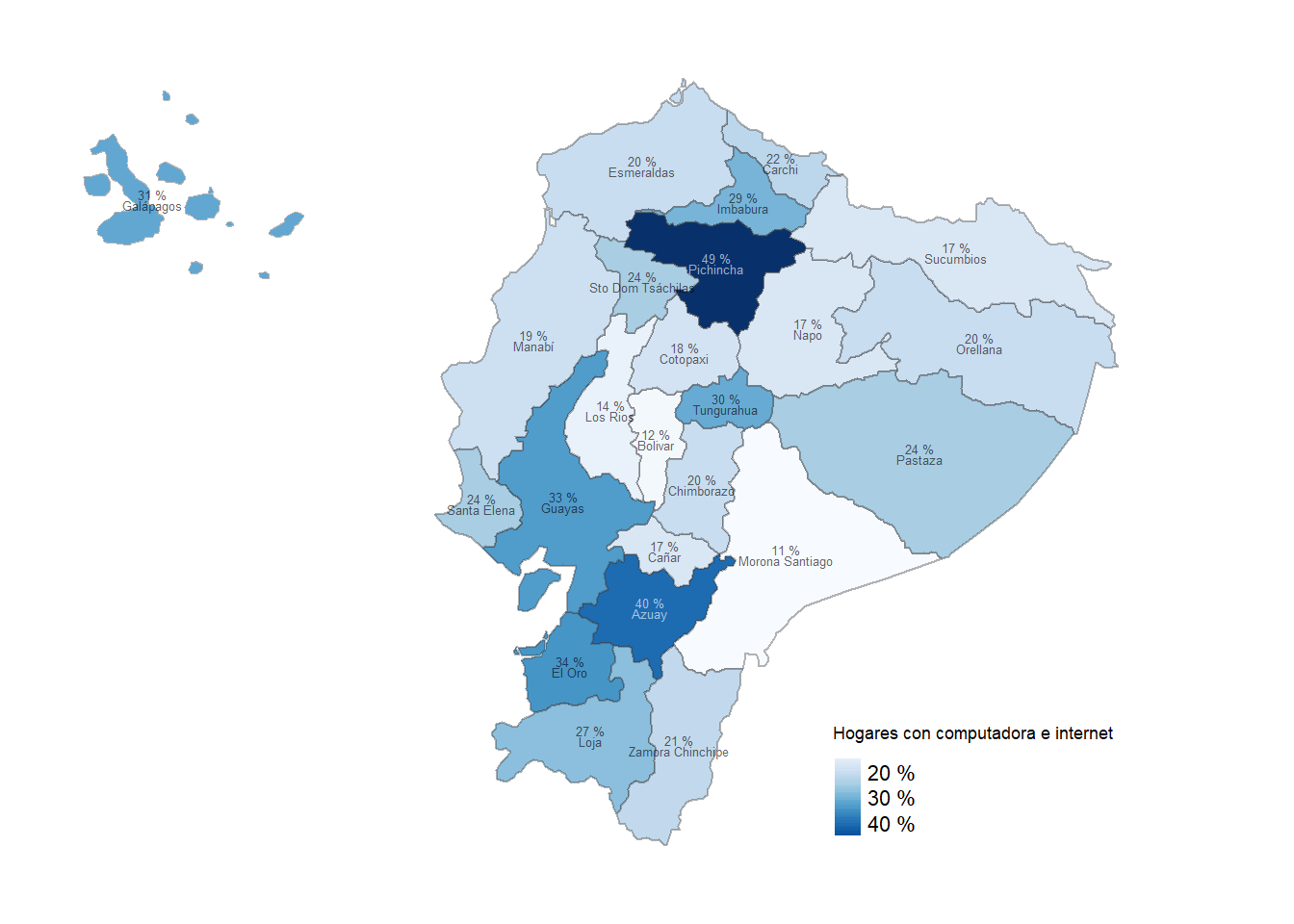 En los siguientes mapas te mostramos el porcentaje de hogares en Ecuador por provincia que tienen al menos una computadora, acceso a Internet, y más importante, ambos. Tú mismo puedes sacar tus conclusiones, pero si tú y todos tus vecinos tienen una laptop e Internet, verás que esa no es la realidad de la mayoría.