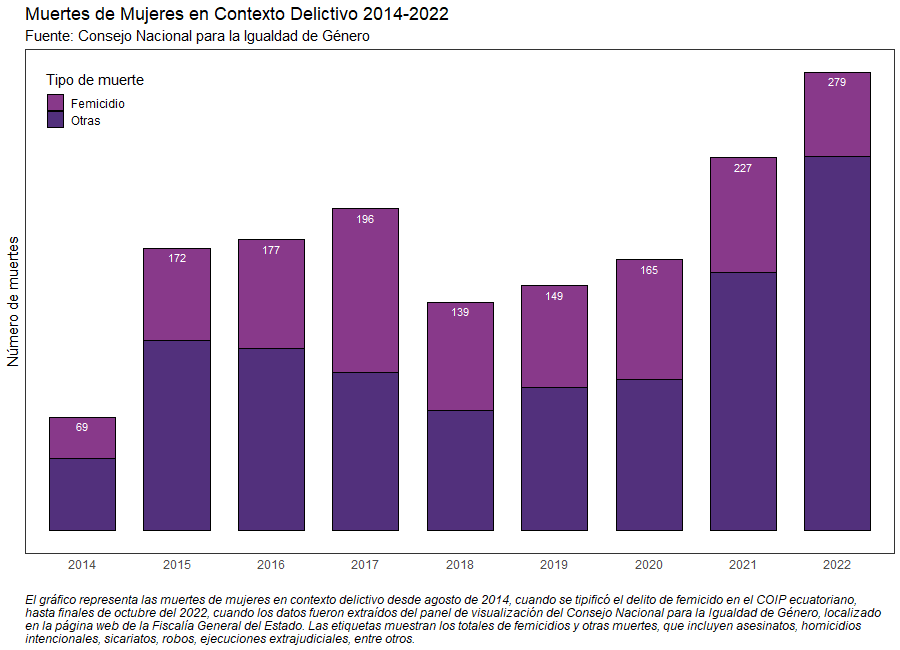 El asesinato de la abogada quiteña María Belen Bernal fue uno de los recientes detonantes sobre la situación enfrentada por las mujeres ecuatorianas para la opinión pública; tristemente, el asesinato de la abogada Bernal, así como los casos de Naomi Arcentales, Amparo C., Paola Ortega, son solo casos visibilizados de una cruda realidad que amenaza la vida de las mujeres ecuatorianas a diario. En Ecuador se registran las muertes violentas de mujeres desde agosto 2014, año en el que se tipificó el delito de femicidio en el COIP1 hasta finales de 2022, momento en el que los autores recuperaron los datos del reporte oficial presentado periódicamente por el Gobierno Nacional, mediante la Comisión Especial de Estadística de Seguridad, Justicia, Crimen y Transparencia2. Las cifras separan a las muertes de mujeres en dos categorías diferentes. Una es el femicidio: “una persona que, como resultado de relaciones de poder manifestadas en cualquier tipo de violencia, da muerte a una mujer por el hecho de serlo o por su condición de género”3.